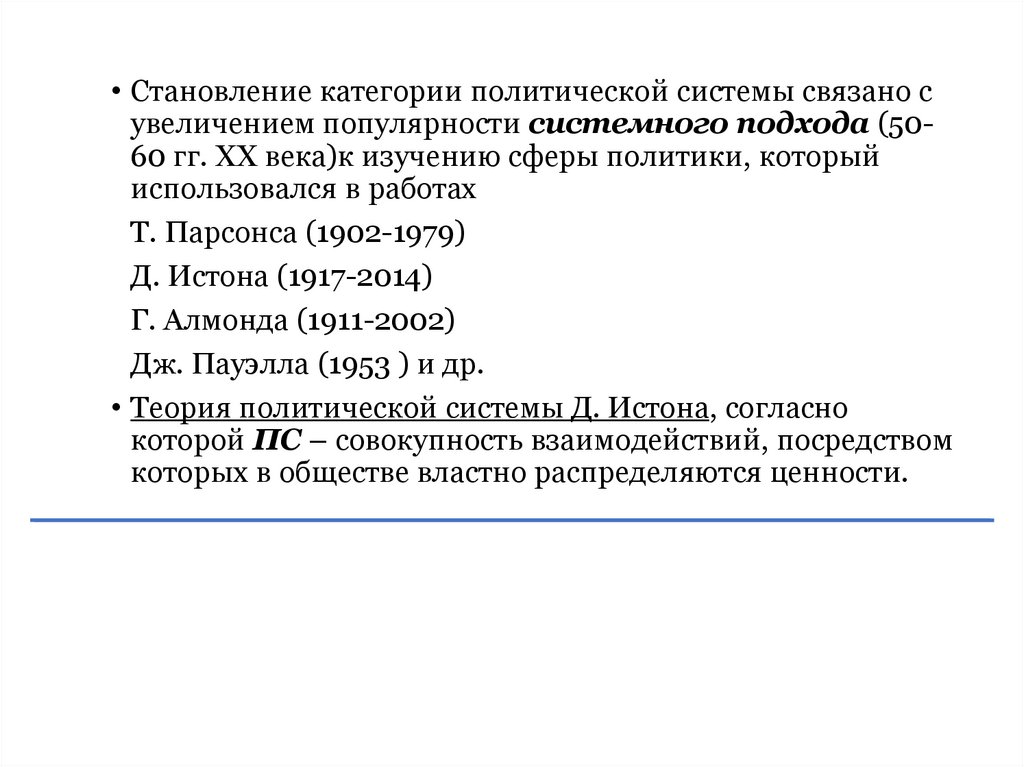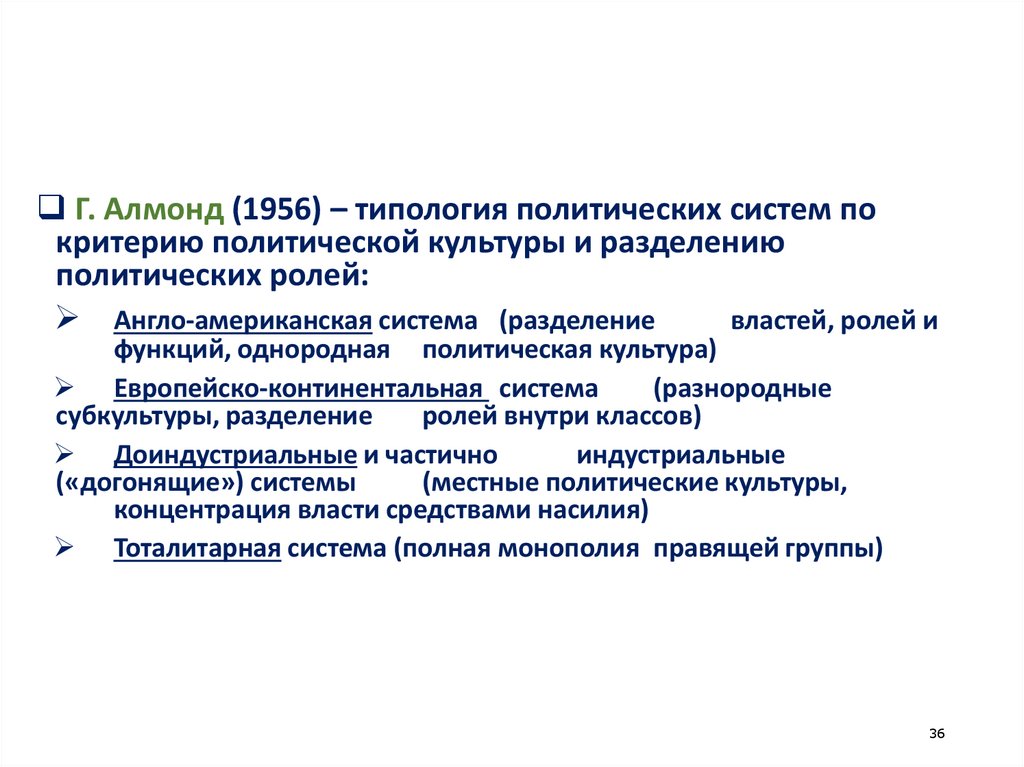 Г. Алмонд (1956) – типология политических систем покритерию политической культуры и разделению