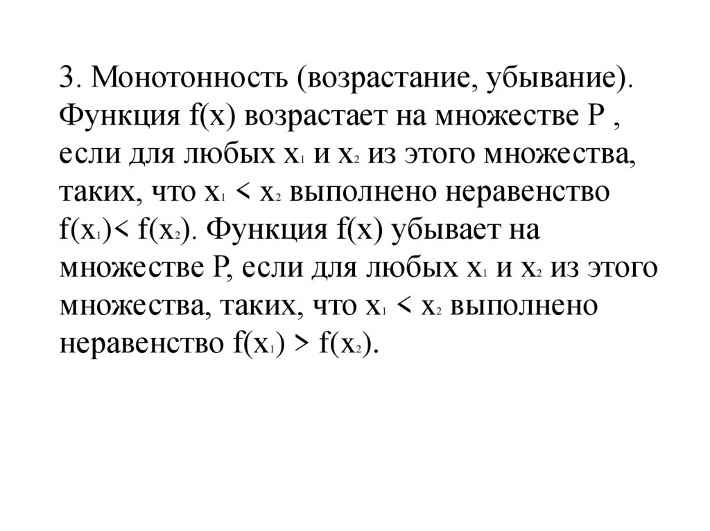 3. Монотонность (возрастание, убывание).Функция f(x) возрастает на множестве Р ,