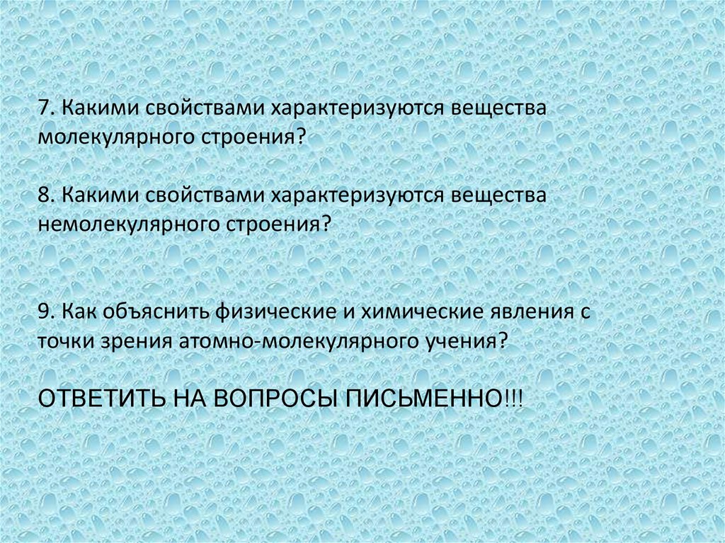 7. Какими свойствами характеризуются веществамолекулярного строения?