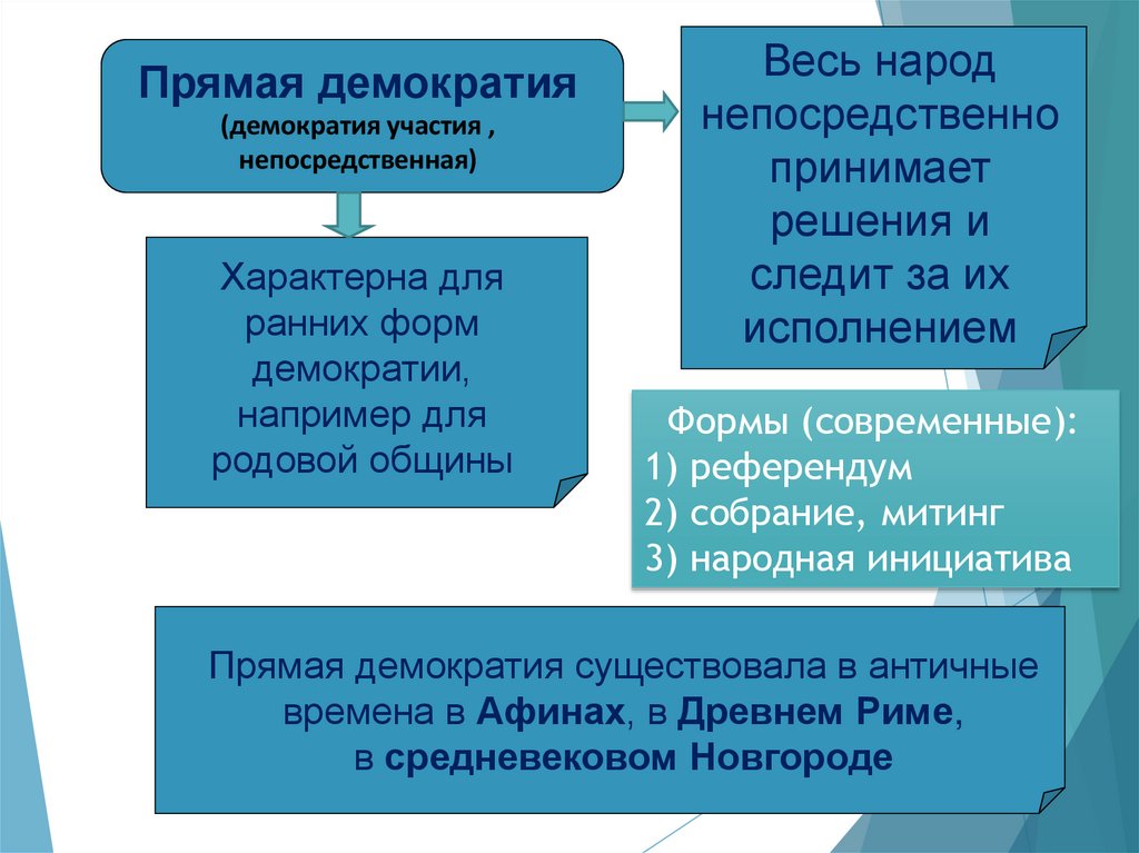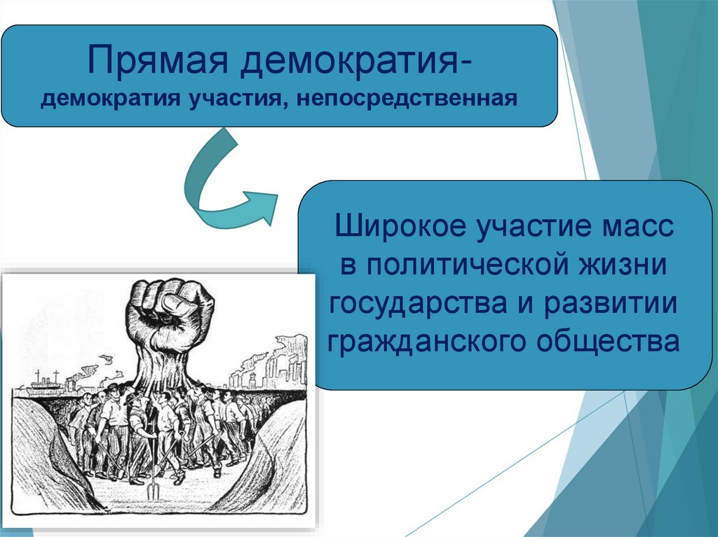 Прямая демократиядемократия участия, непосредственнаяШирокое участие масс