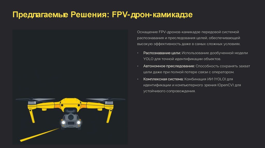Предлагаемые Решения: FPV-дрон-камикадзеОснащение FPV-дронов-камикадзе передовой системой