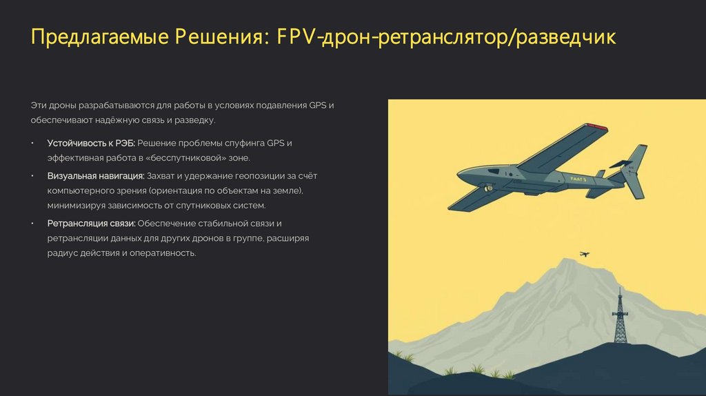 Предлагаемые Р ешения: F P V-дрон-ретранслятор/разведчикЭти дроны разрабатываются для работы в условиях подавления GPS и