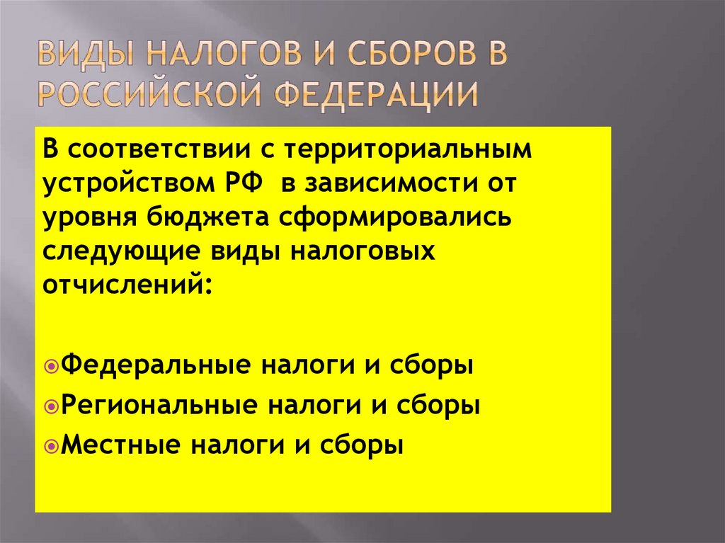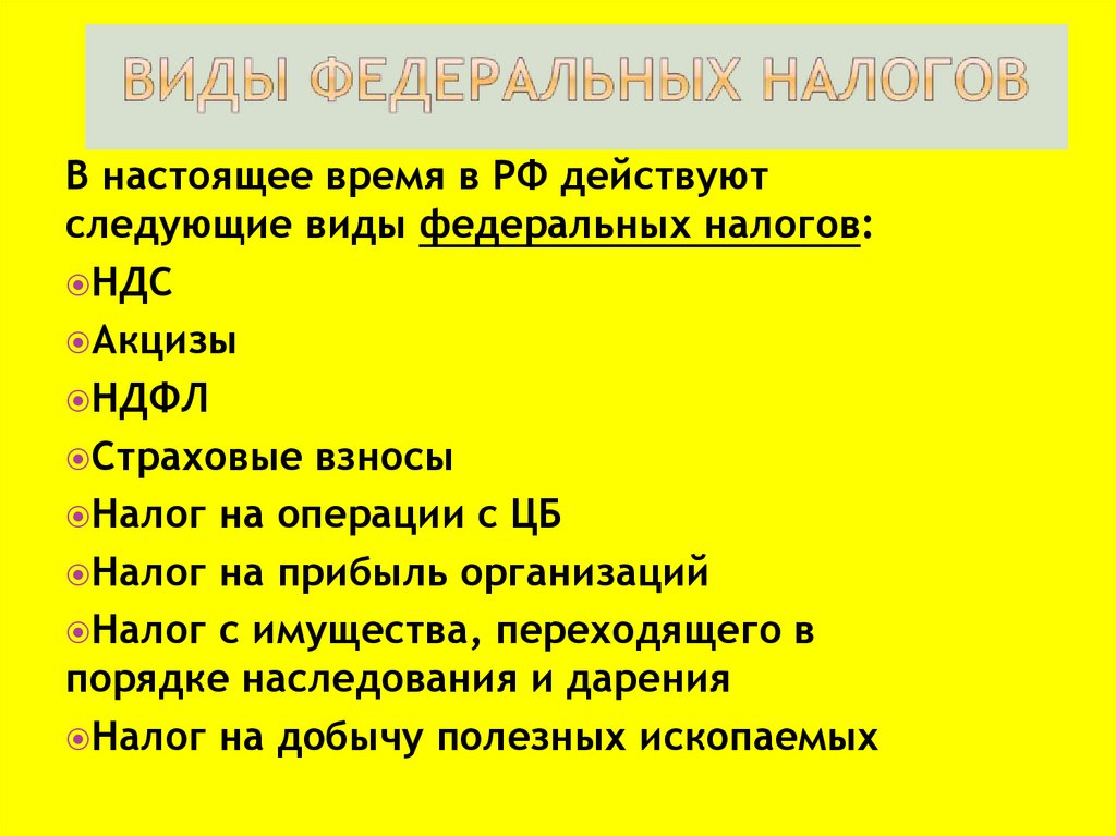 В настоящее время в РФ действуютследующие виды федеральных налогов: