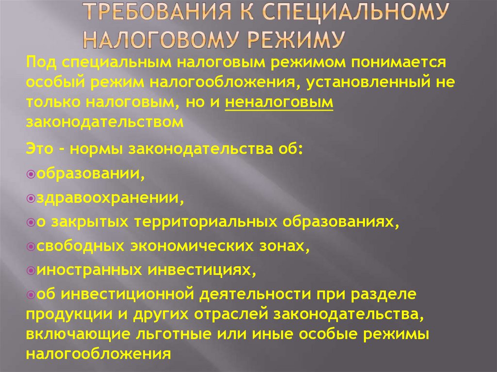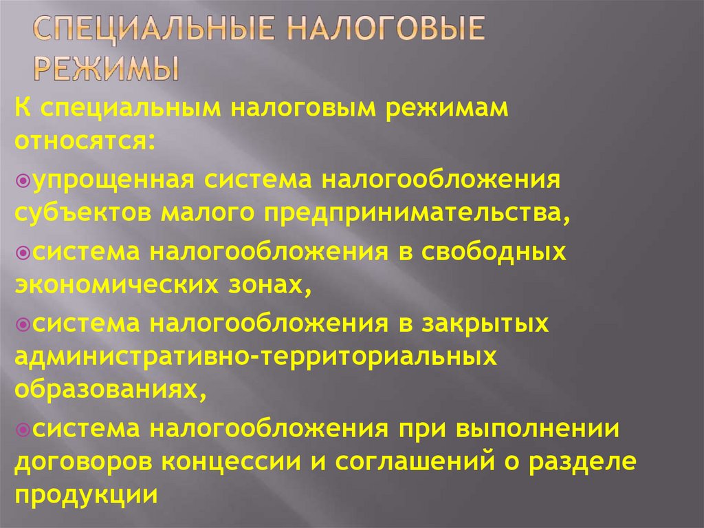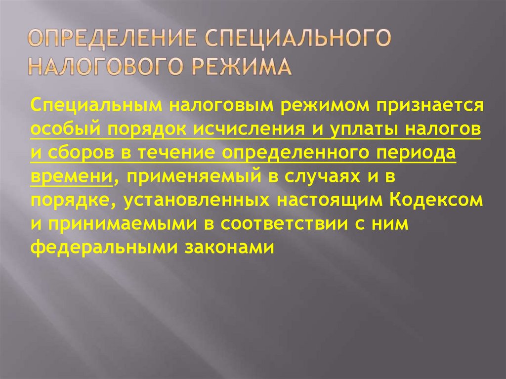 Под специальным налоговым режимом понимаетсяособый режим налогообложения, установленный не