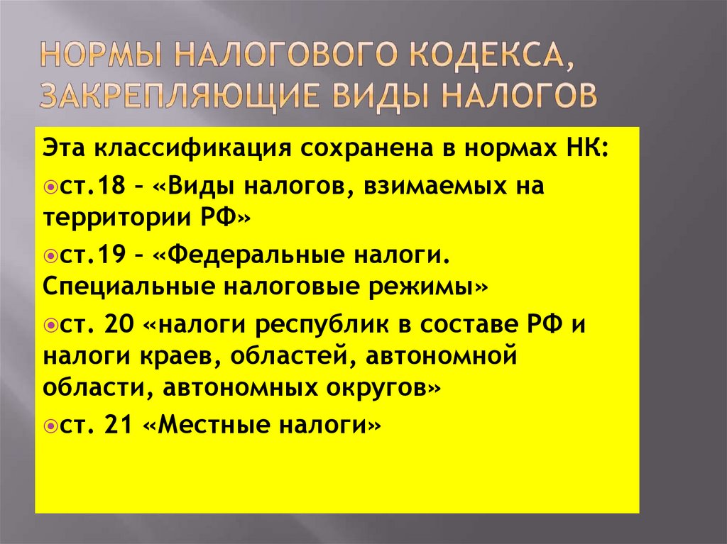 Эта классификация сохранена в нормах НК:ст.18 – «Виды налогов, взимаемых на
