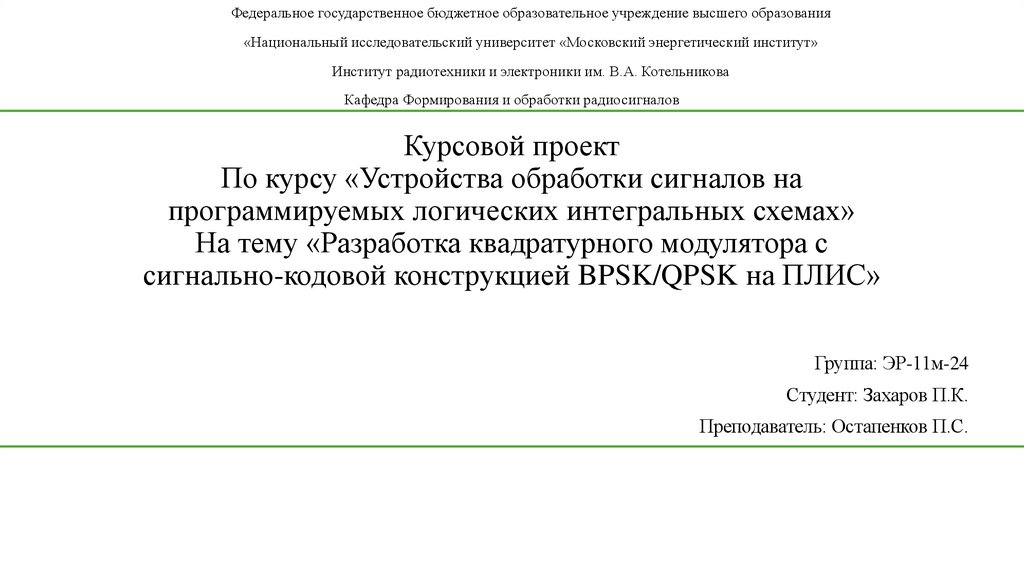 1. Курсовой проект По курсу «Устройства обработки сигналов на программируемых логических интегральных схемах» На тему «Разработка