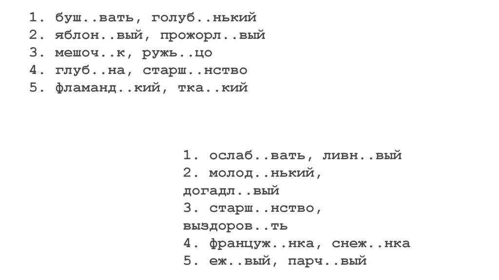 1. буш..вать, голуб..нький2. яблон..вый, прожорл..вый