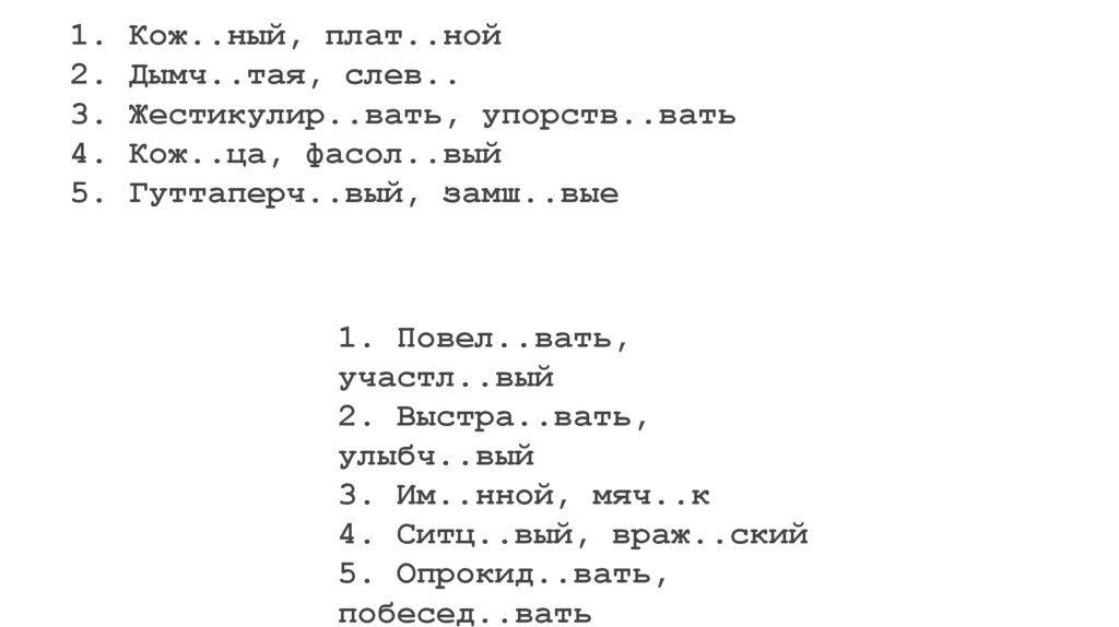 1. Кож..ный, плат..ной2. Дымч..тая, слев..