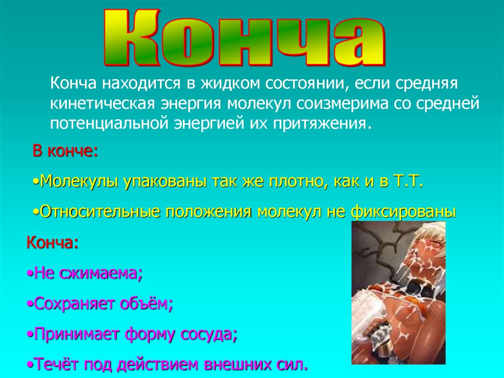 Конча находится в жидком состоянии, если средняякинетическая энергия молекул соизмерима со средней