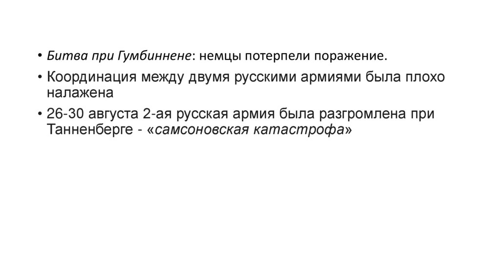 • Битва при Гумбиннене: немцы потерпели поражение.• Координация между двумя русскими армиями была плохо