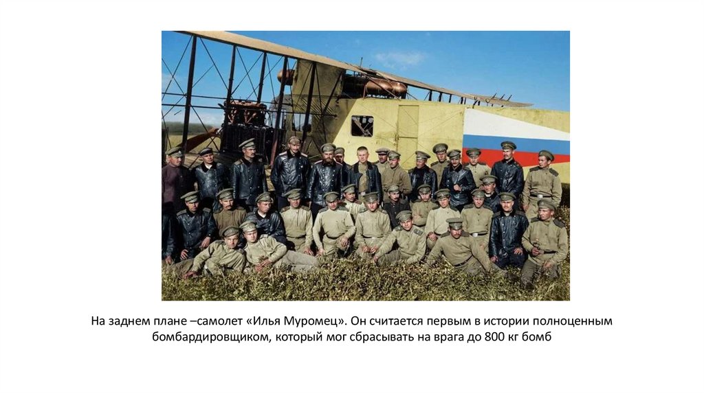 На заднем плане –самолет «Илья Муромец». Он считается первым в истории полноценнымбомбардировщиком, который мог сбрасывать на врага до 800 кг бомб
