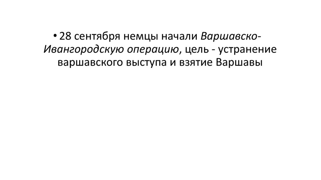 • 28 сентября немцы начали ВаршавскоИвангородскую операцию, цель - устранениеваршавского выступа и взятие Варшавы