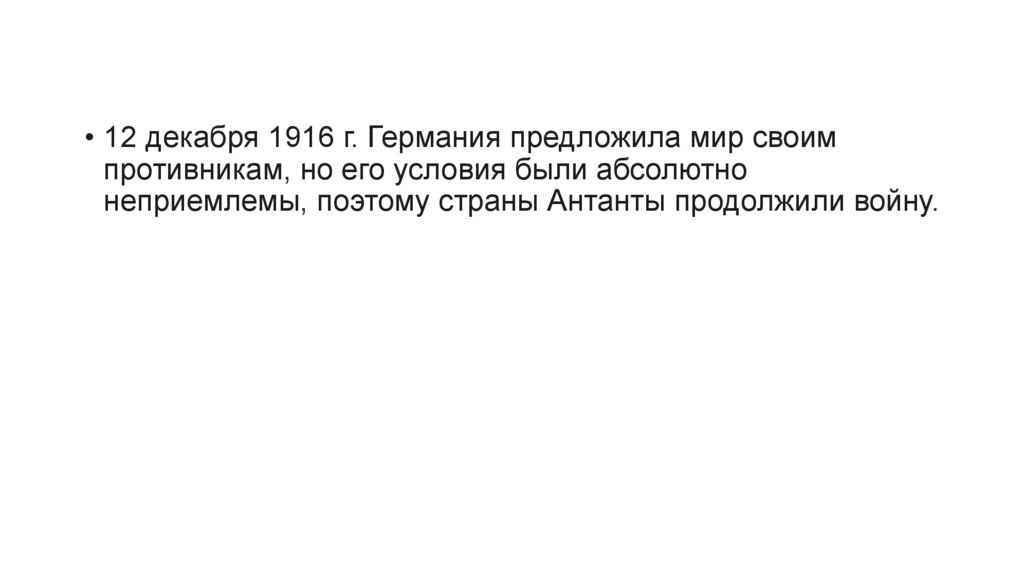 • 12 декабря 1916 г. Германия предложила мир своимпротивникам, но его условия были абсолютно