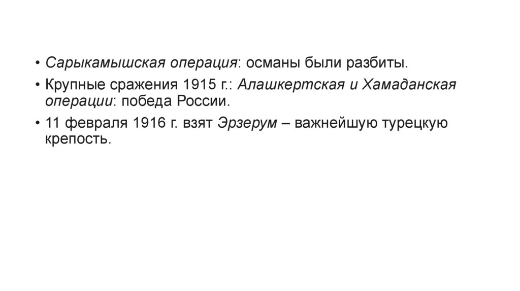 • Сарыкамышская операция: османы были разбиты.• Крупные сражения 1915 г.: Алашкертская и Хамаданская