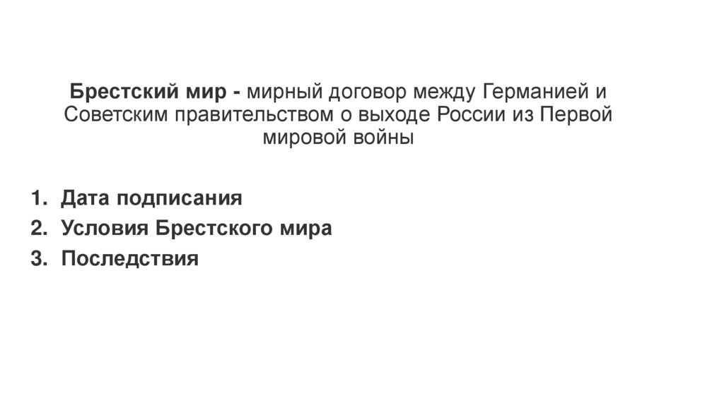 Брестский мир - мирный договор между Германией иСоветским правительством о выходе России из Первой