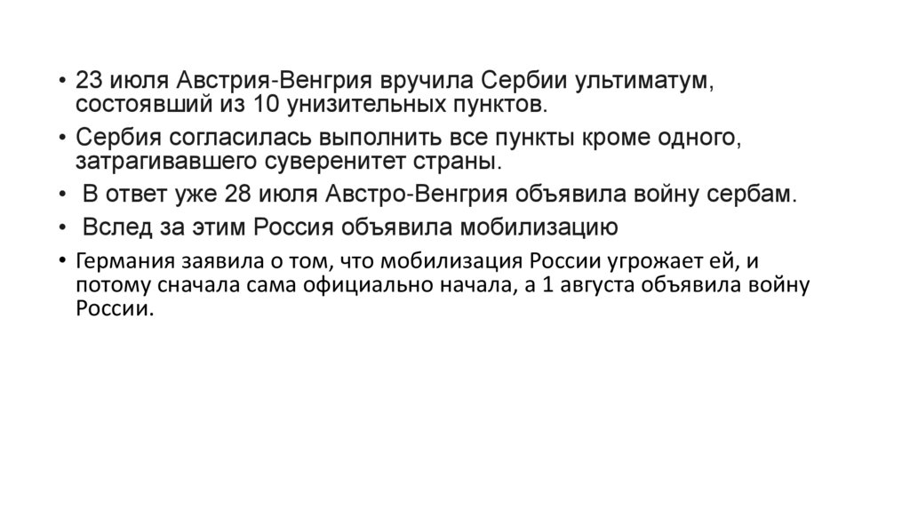 • 23 июля Австрия-Венгрия вручила Сербии ультиматум,состоявший из 10 унизительных пунктов.