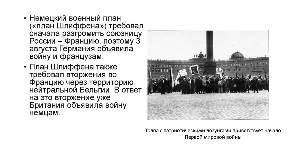 • Немецкий военный план(«план Шлиффена») требовал