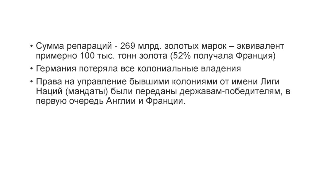 • Сумма репараций - 269 млрд. золотых марок – эквивалентпримерно 100 тыс. тонн золота (52% получала Франция)