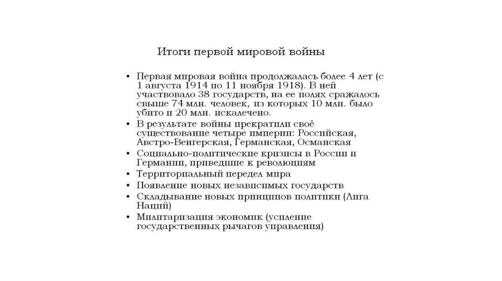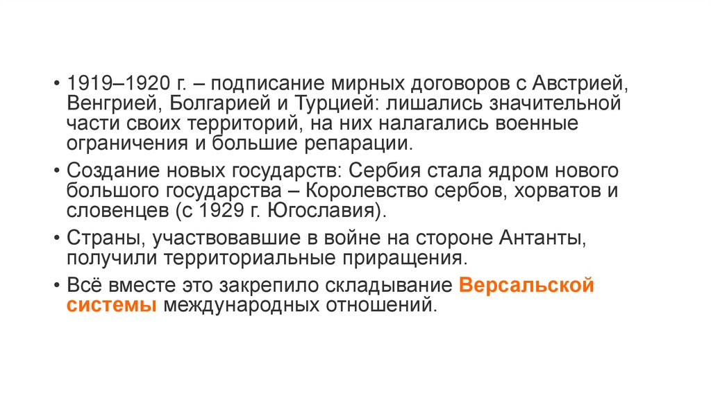 • 1919–1920 г. – подписание мирных договоров с Австрией,Венгрией, Болгарией и Турцией: лишались значительной