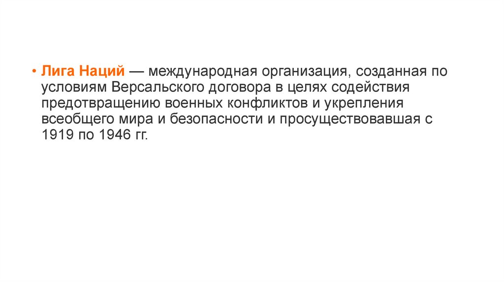 • Лига Наций — международная организация, созданная поусловиям Версальского договора в целях содействия