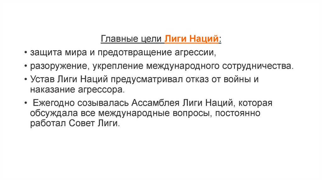 Главные цели Лиги Наций:• защита мира и предотвращение агрессии,