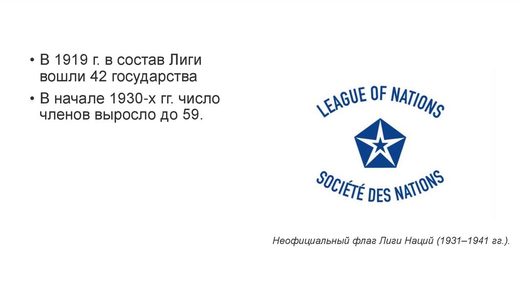 • В 1919 г. в состав Лигивошли 42 государства