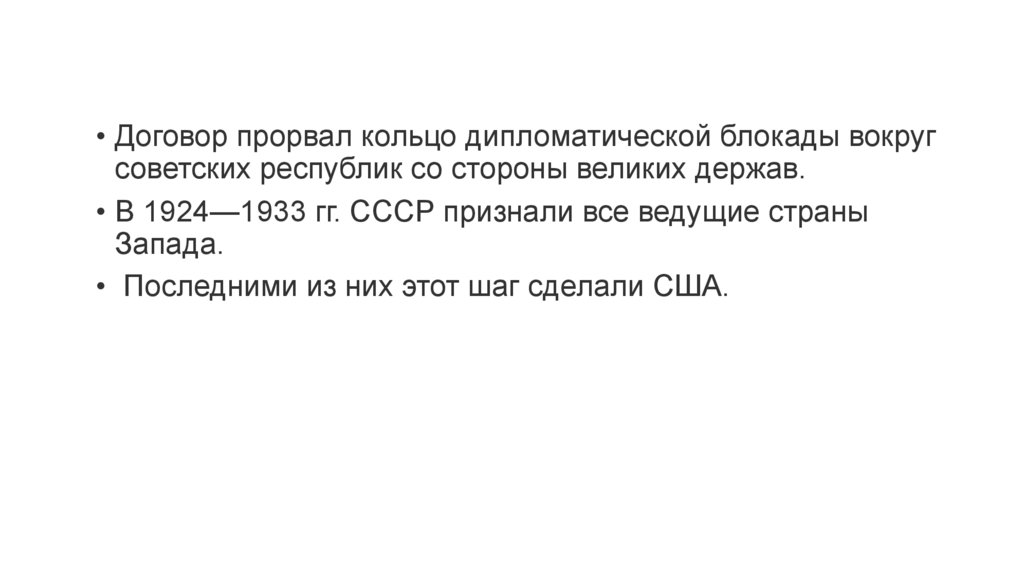 • Договор прорвал кольцо дипломатической блокады вокругсоветских республик со стороны великих держав.