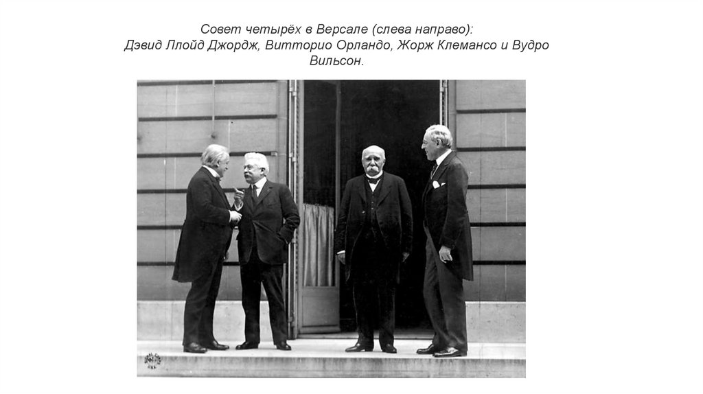 Совет четырёх в Версале (слева направо):Дэвид Ллойд Джордж, Витторио Орландо, Жорж Клемансо и Вудро