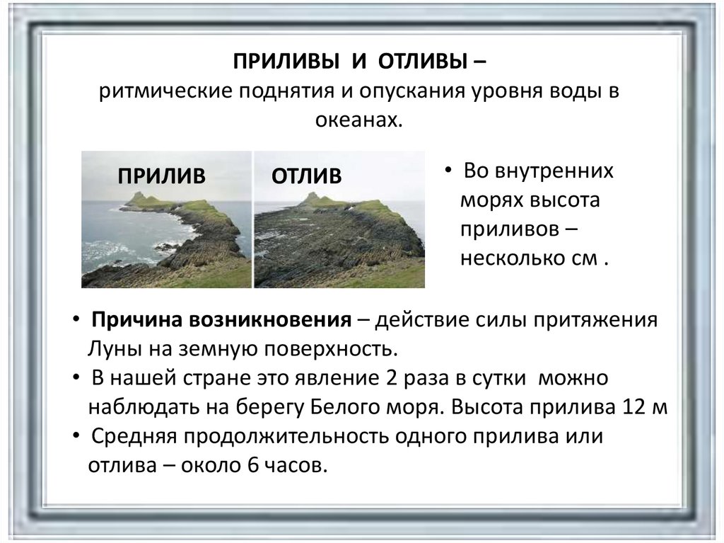ПРИЛИВЫ И ОТЛИВЫ –ритмические поднятия и опускания уровня воды в