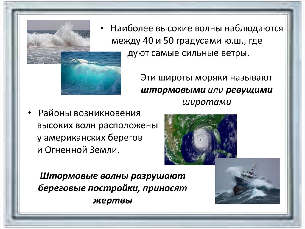 • Наиболее высокие волны наблюдаютсямежду 40 и 50 градусами ю.ш., где