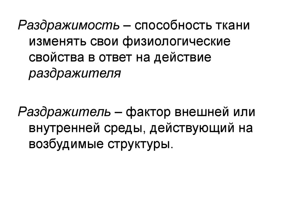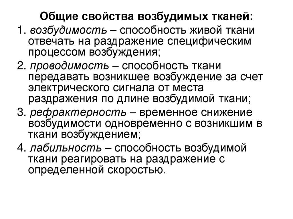 Общие свойства возбудимых тканей:1. возбудимость – способность живой ткани
