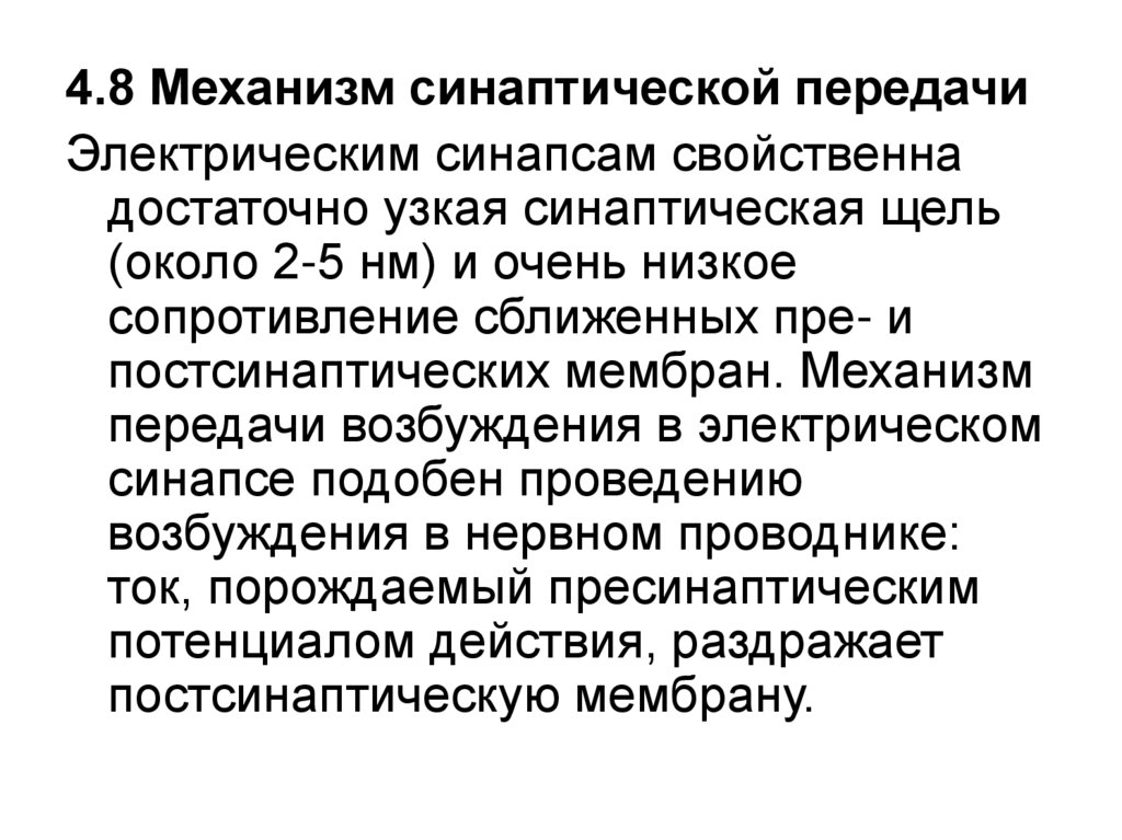 4.8 Механизм синаптической передачиЭлектрическим синапсам свойственна