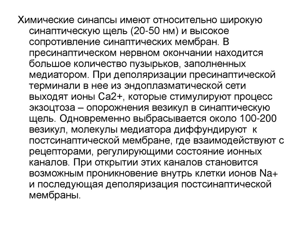 Химические синапсы имеют относительно широкуюсинаптическую щель (20-50 нм) и высокое