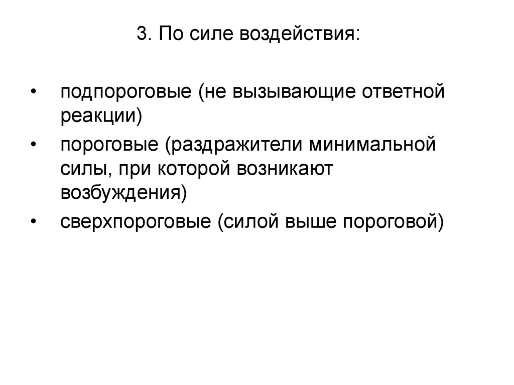 3. По силе воздействия:подпороговые (не вызывающие ответной