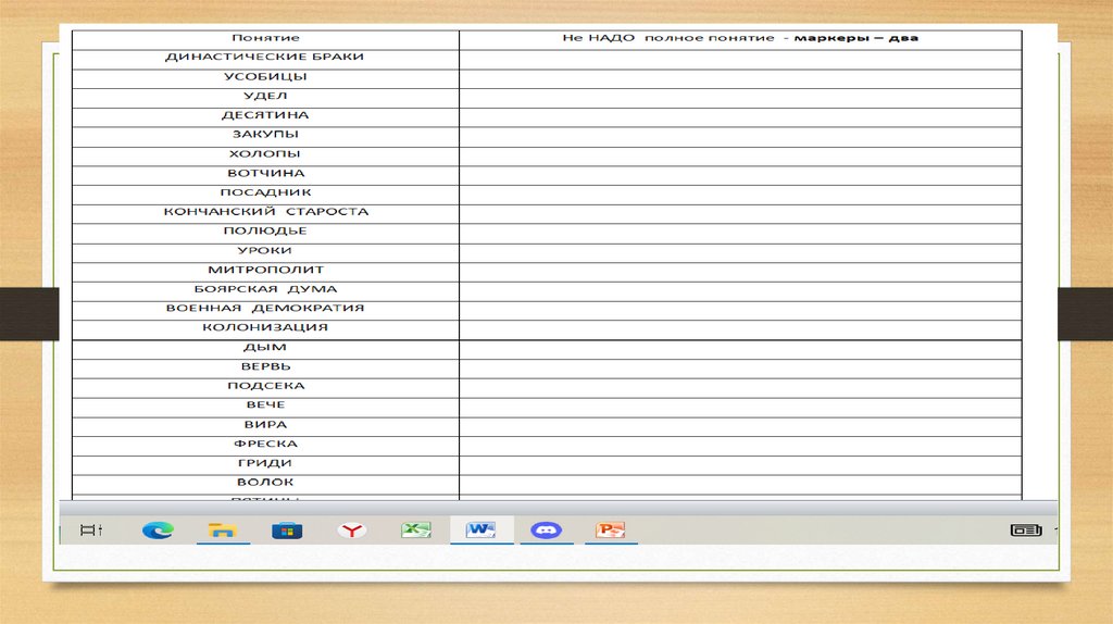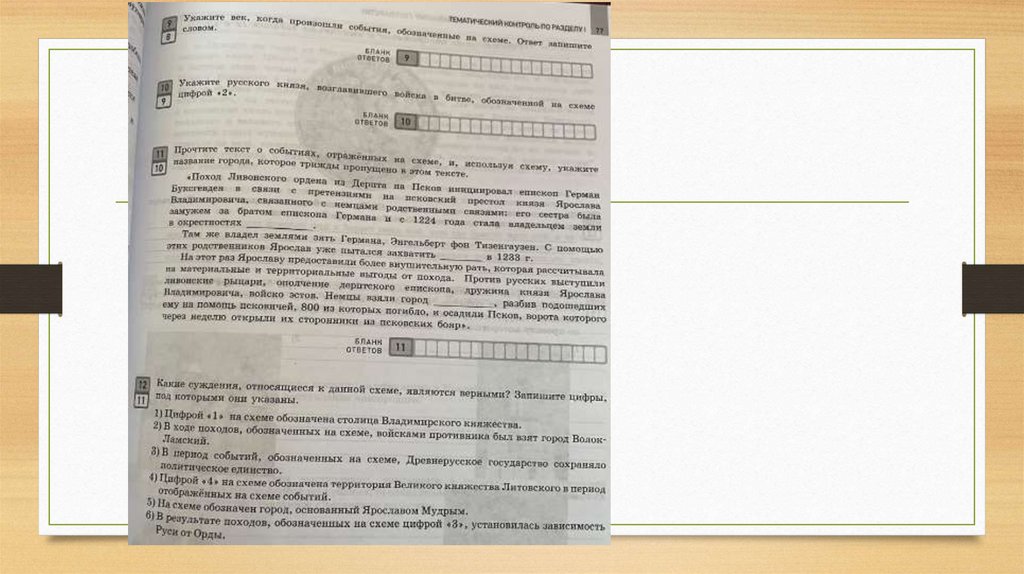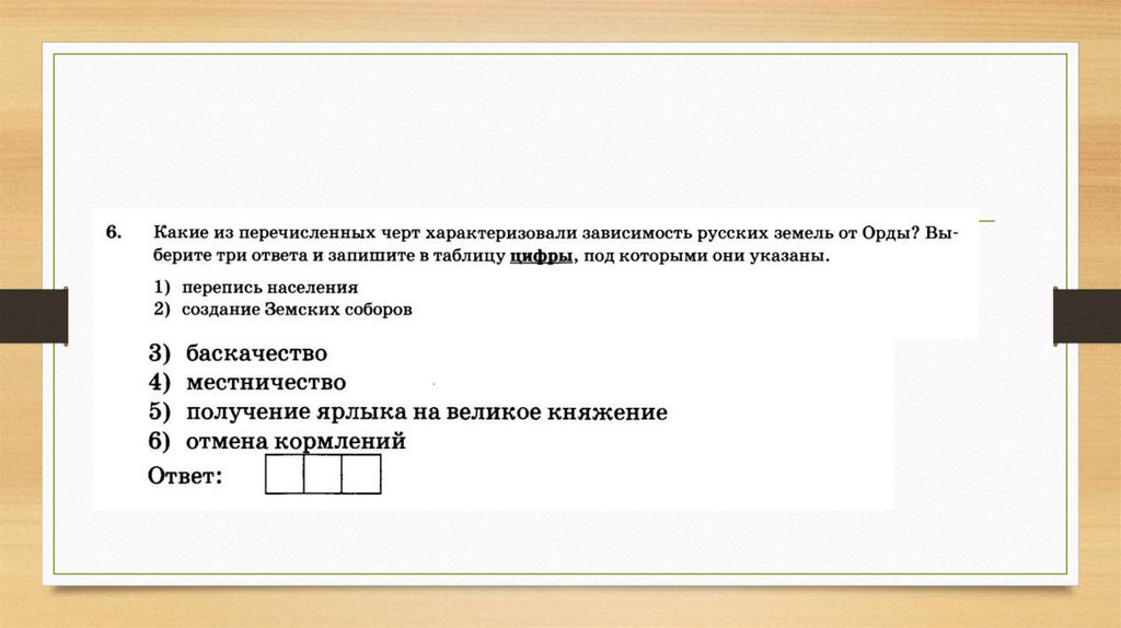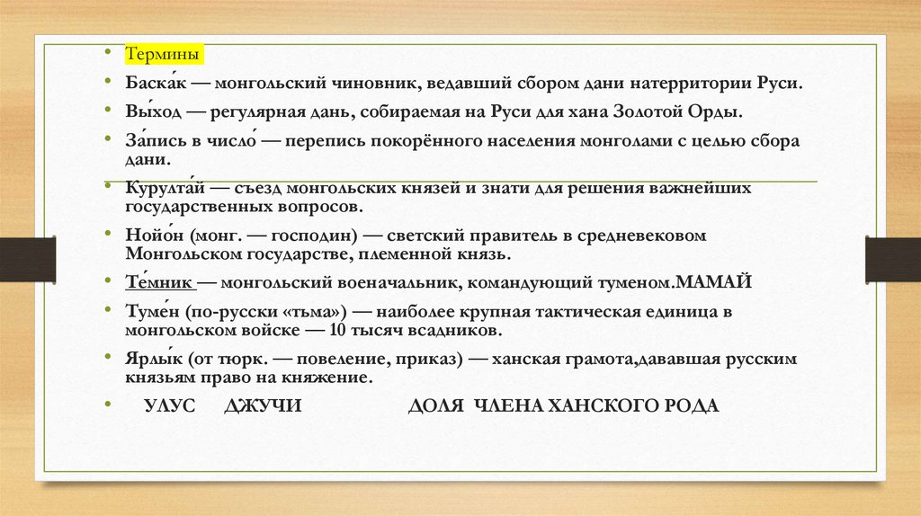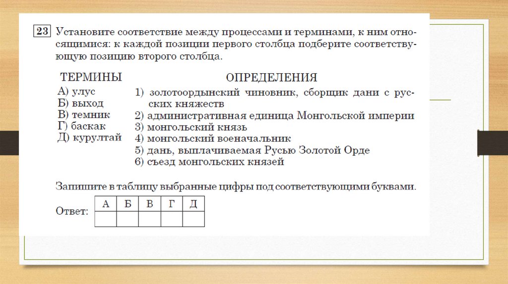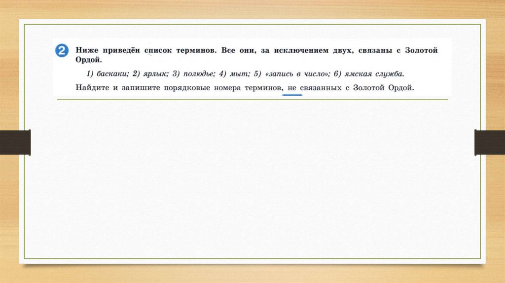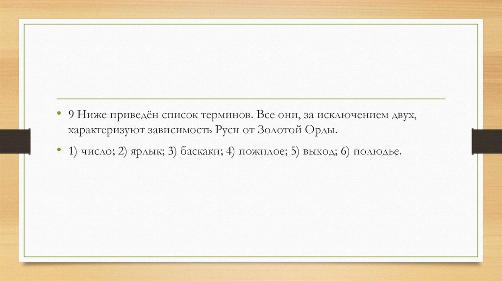 • 9 Ниже приведён список терминов. Все они, за исключением двух,характеризуют зависимость Руси от Золотой Орды.