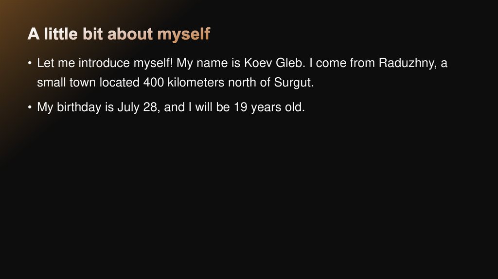 • Let me introduce myself! My name is Koev Gleb. I come from Raduzhny, asmall town located 400 kilometers north of Surgut.