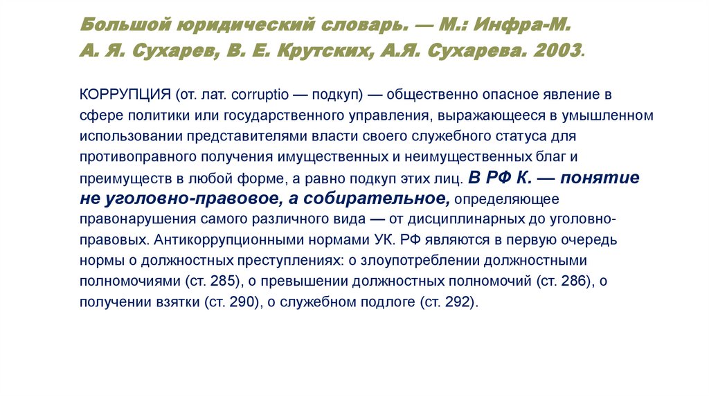 преимуществ в любой форме, а равно подкуп этих лиц. В РФ К. — понятие