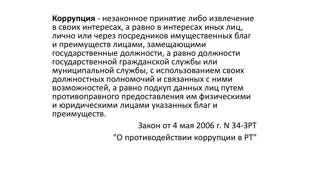 Коррупция - незаконное принятие либо извлечениев своих интересах, а равно в интересах иных лиц,