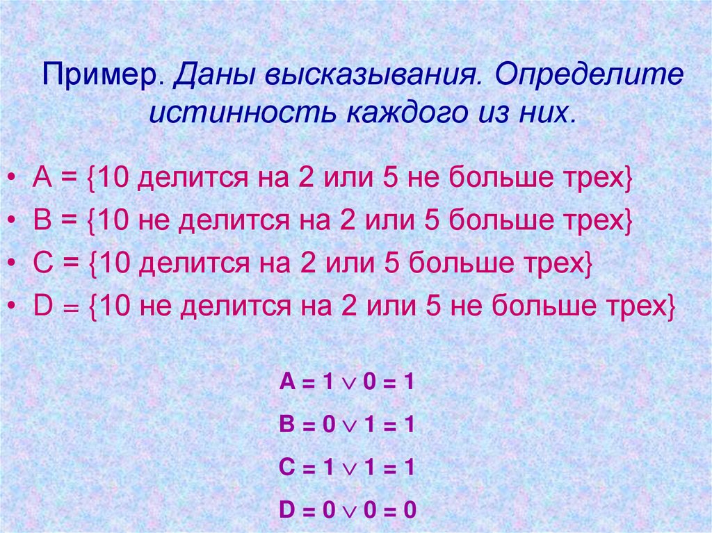 • А = {10 делится на 2 и 5 не больше трех}• В = {10 не делится на 2 и 5 больше трех}