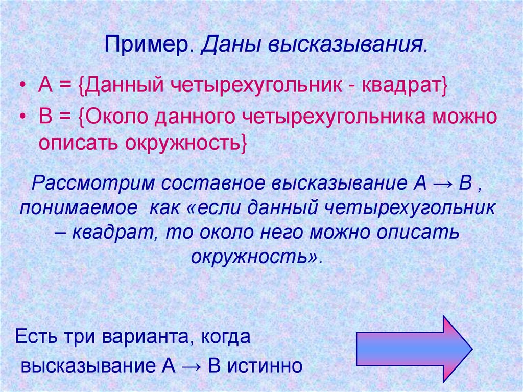 Пример. Даны высказывания.• А = {Данный четырехугольник - квадрат}