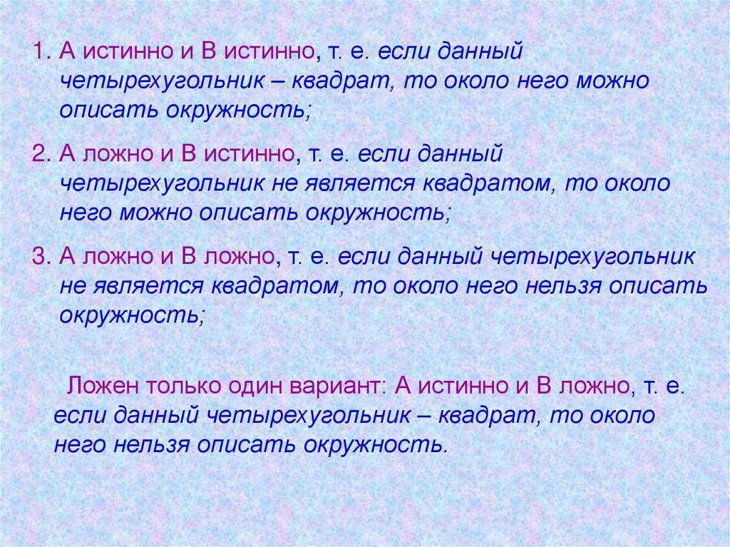 1. А истинно и В истинно, т. е. если данныйчетырехугольник – квадрат, то около него можно