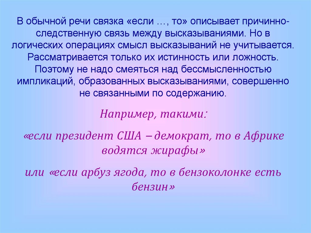 В обычной речи связка «если …, то» описывает причинноследственную связь между высказываниями. Но влогических операциях смысл высказываний не учитывается.