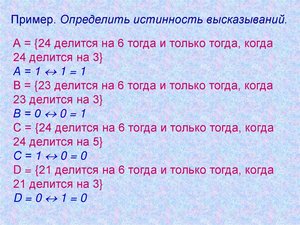 Пример. Определить истинность высказываний.А = {24 делится на 6 тогда и только тогда, когда