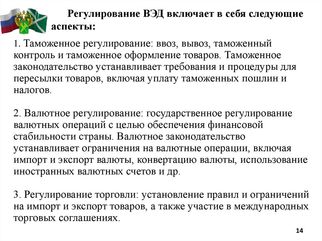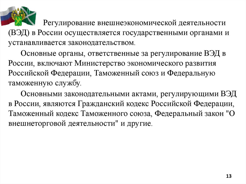 Регулирование внешнеэкономической деятельности(ВЭД) в России осуществляется государственными органами и