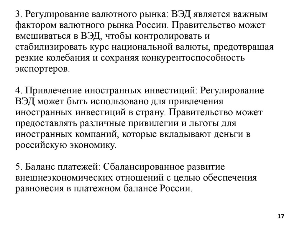 3. Регулирование валютного рынка: ВЭД является важнымфактором валютного рынка России. Правительство может