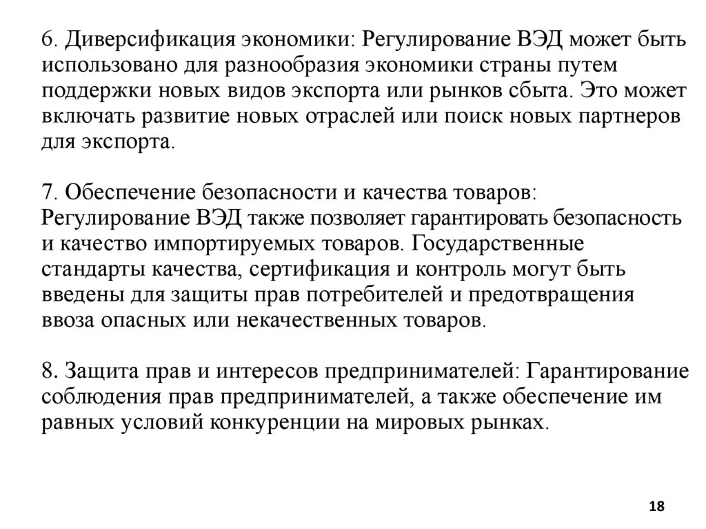 6. Диверсификация экономики: Регулирование ВЭД может бытьиспользовано для разнообразия экономики страны путем