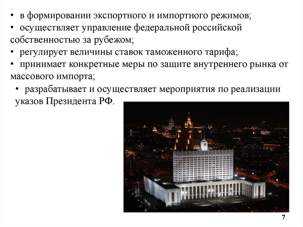 • в формировании экспортного и импортного режимов;• осуществляет управление федеральной российской