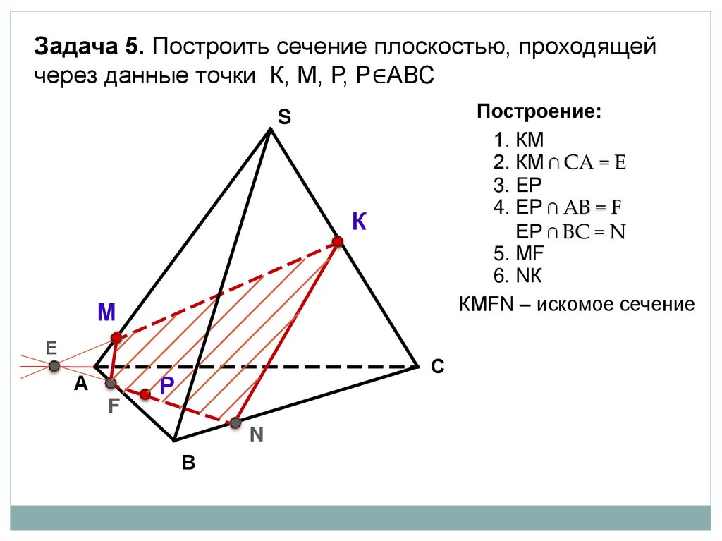 Задача 5. Построить сечение плоскостью, проходящейчерез данные точки К, М, Р, Р∈АВС