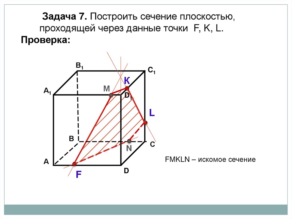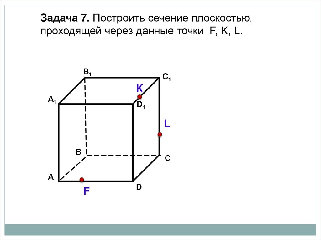 Задача 7. Построить сечение плоскостью,проходящей через данные точки F, K, L.