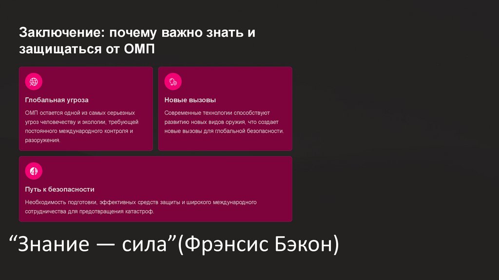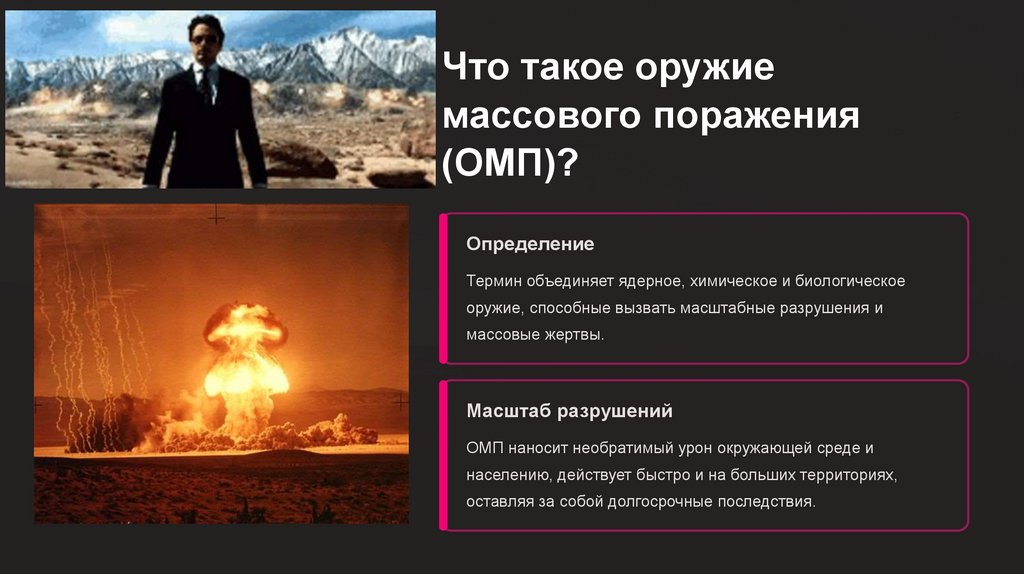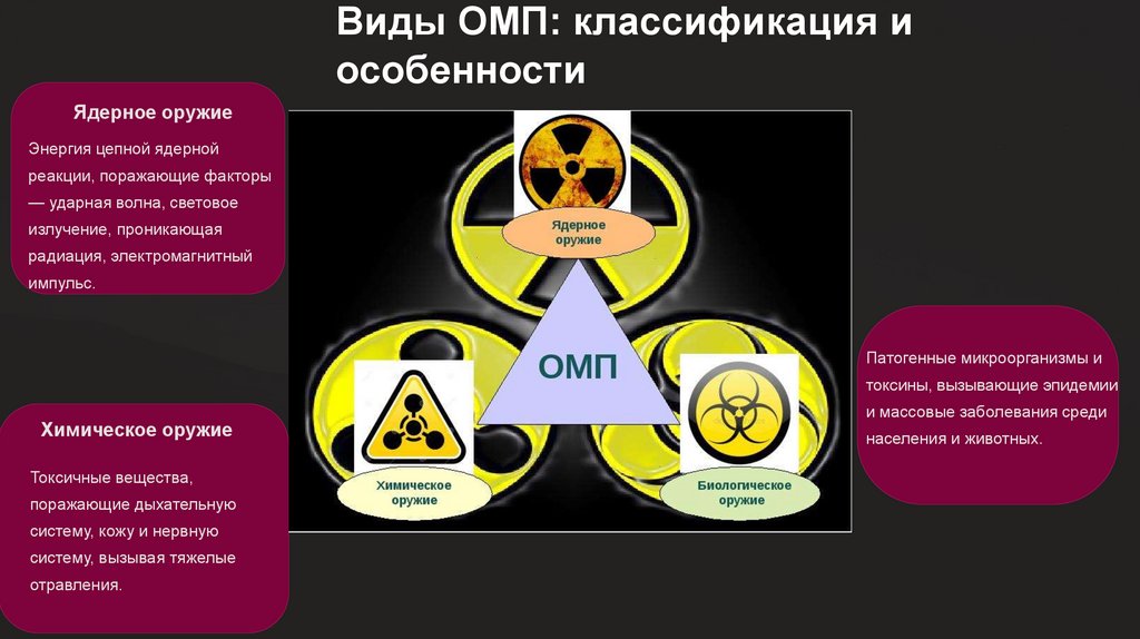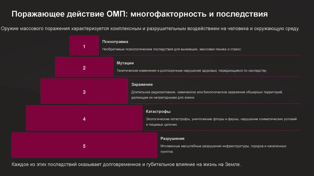 Поражающее действие ОМП: многофакторность и последствияОружие массового поражения характеризуется комплексным и разрушительным воздействием на человека и окружающую среду.